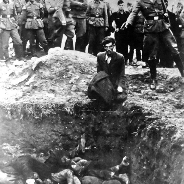 This horrific photo originates from a member of the German Einsatzgruppe D, and comes from his personal album. The photo is simply labeled on the back as "The Last Jew of Vinnitsa." It shows a Jewish man about to be executed in front of a mass grave near Vinnitsa, Ukraine. All 28,000 Jews from the surrounding area were massacred by the Einsatzgruppen at the time.